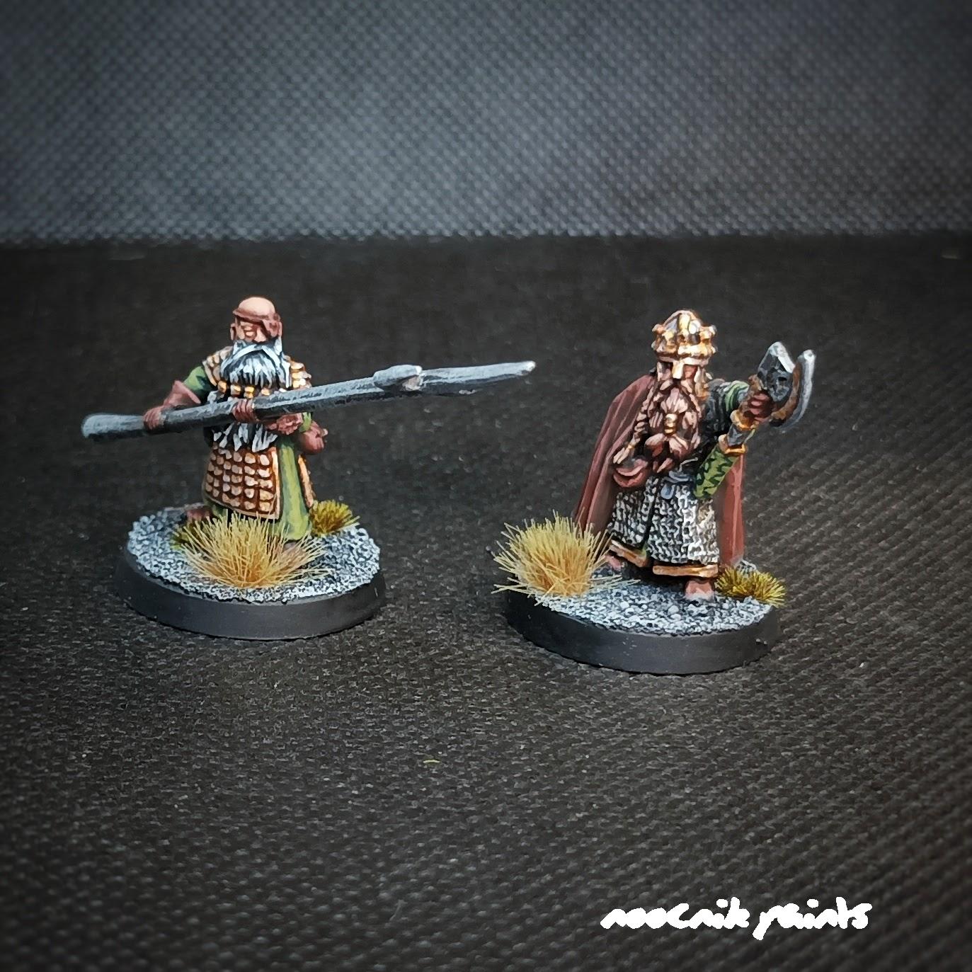 The Durin and Mardin figures are made of metal and have a high level of detail. Durin is armed with a richly decorated ax and Mardin is armed with a spear. These figures are part of the Khazad-dûm army and can be used as commanders or heroes in the game.